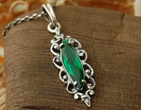 Delikatny srebrny wisiorek w którego centralnym miejscu zakuty został pięknie wybarwiony szmaragd synetyczny. Wisiorek pięknie się prezentuje.