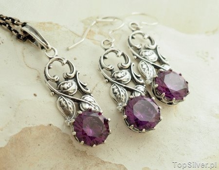 Srebrny zestaw w składzie kolczyki i wisiorek, symbolikš nawišzujšcy do okresu secesji, w którego srebrne motywy rolinne zakuty został okršgły ametyst.