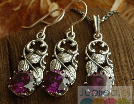 Srebrny zestaw w składzie kolczyki i wisiorek, symboliką nawiązujący do okresu secesji, w którego oksydowane motywy roślinne zakuty został okrągły ametyst syntetyczny.