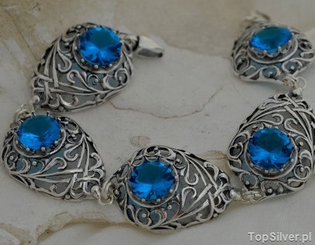 Wytworna, srebrna, oksydowana bransoleta, w której mistrzowsko wykonane ażurowe elementy wkomponowano okrągły, pięknie wyszlifowany akwamaryn (synt). Bransoleta składa się z pięciu jednakowych elementów.