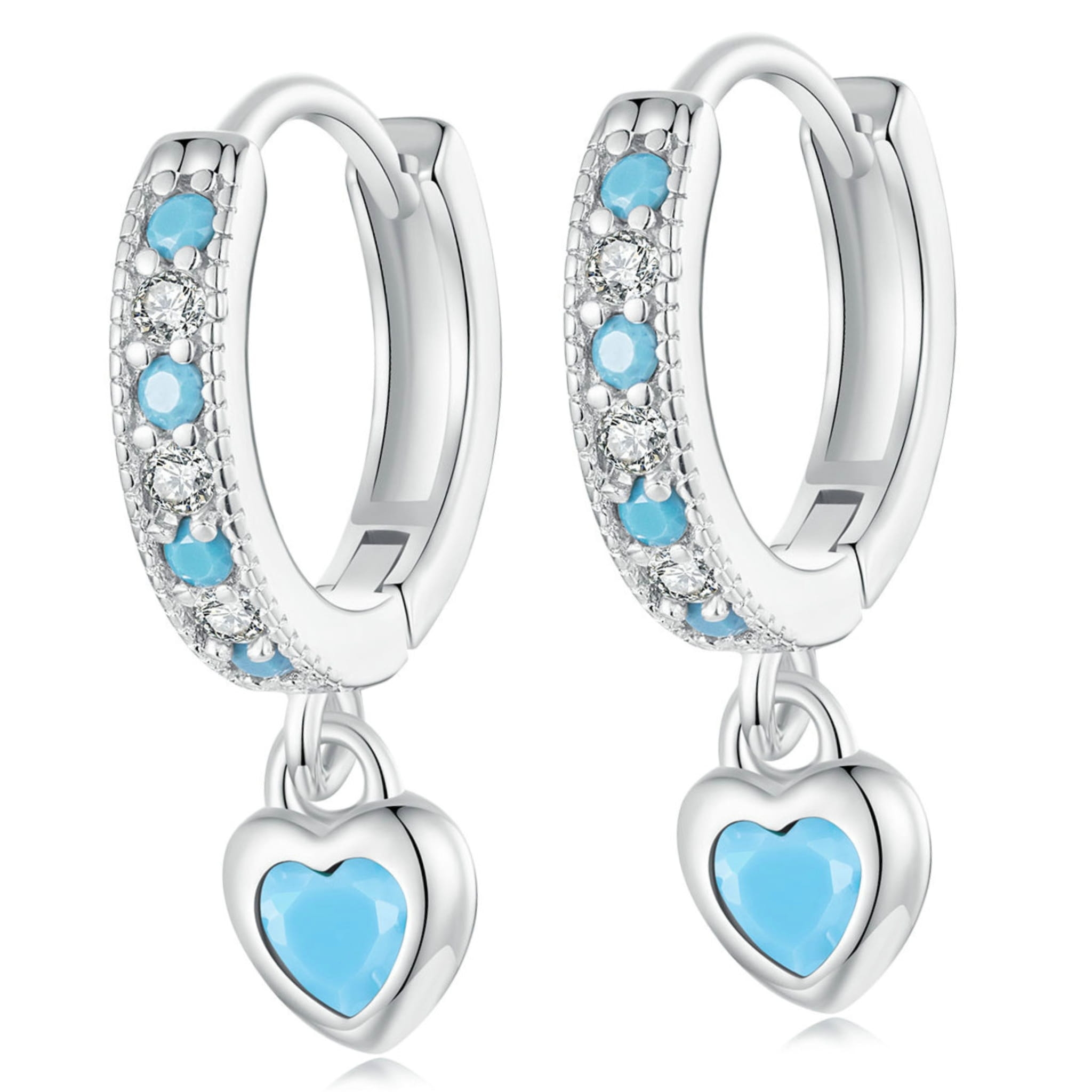 Koła z wiszącymi niebieskimi sercami srebrne kolczyki zatrzaski srebro 925