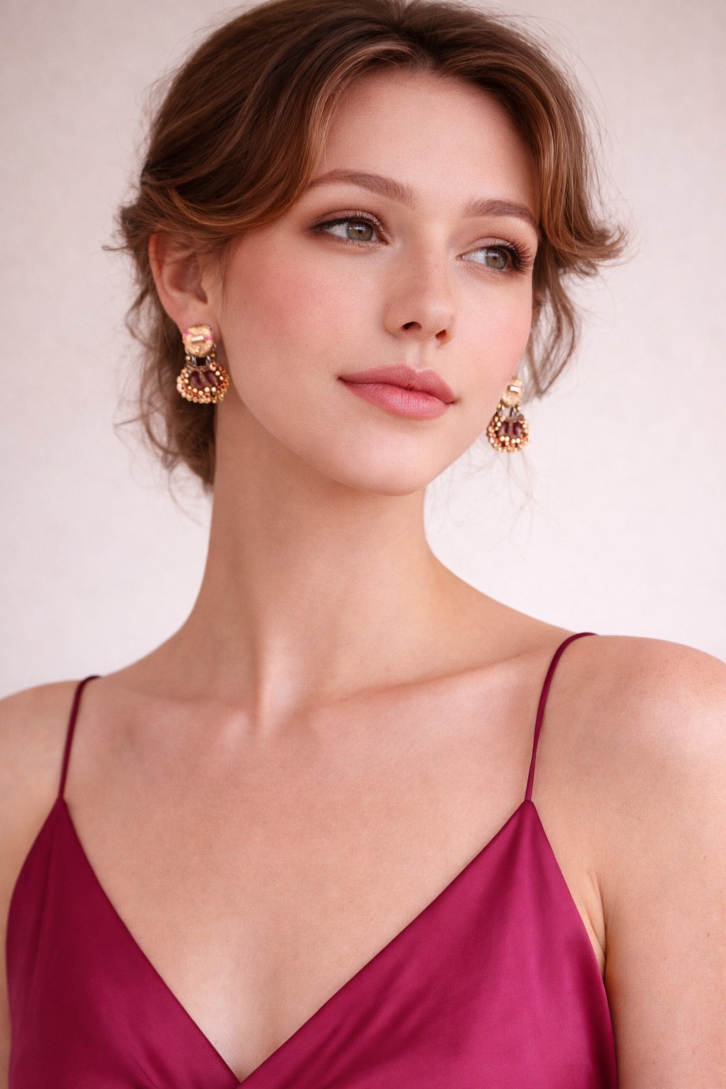 Kolczyki o ciepłej, biżuteryjnej kompozycji, które łączą świetlisty blask złota z nasyconymi tonami malinowego różu, burgundu i delikatnego pudrowego beżu. Ich forma przyciąga spojrzenie nie tylko kolorem, ale także misternym układem drobnych detali, które tworzą harmonijną, dekoracyjną całość. To model pełen kobiecego wdzięku, subtelnego światła i artystycznego charakteru.