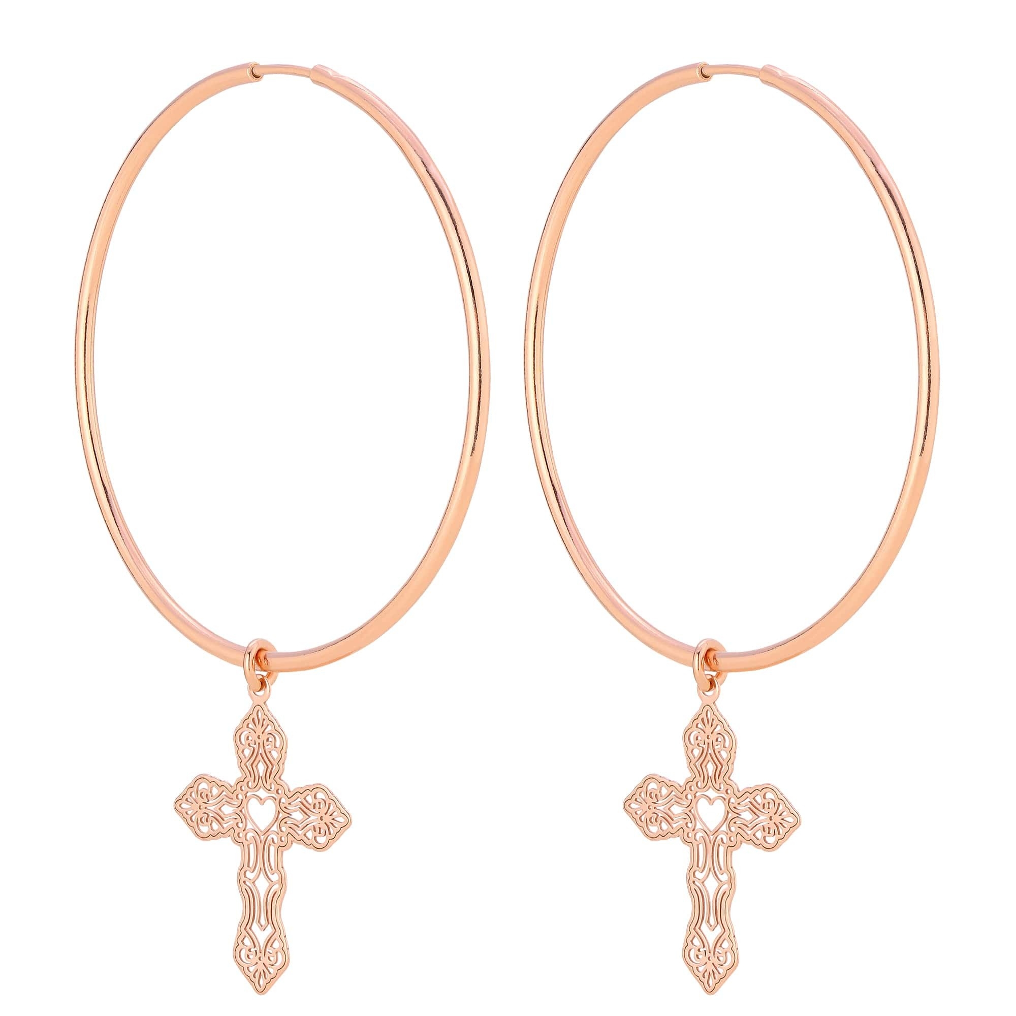 Złote kolczyki duże koła z krzyżami. Całość wykonana ze srebra 925 powlekanego 24 karatowym różowym złotem.