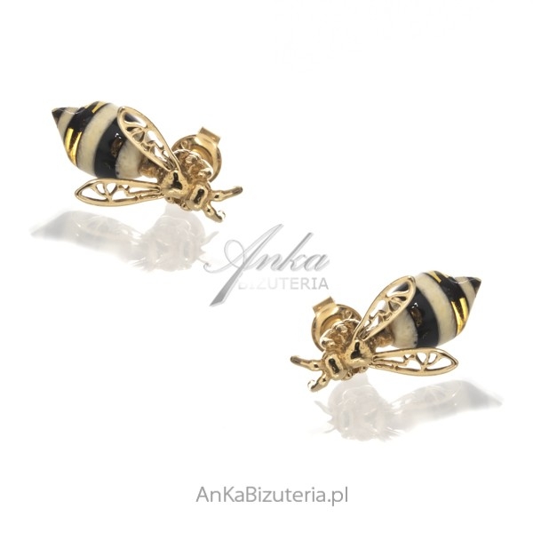 Kolczyki srebrne pozłacane pszczółki z bursztynem