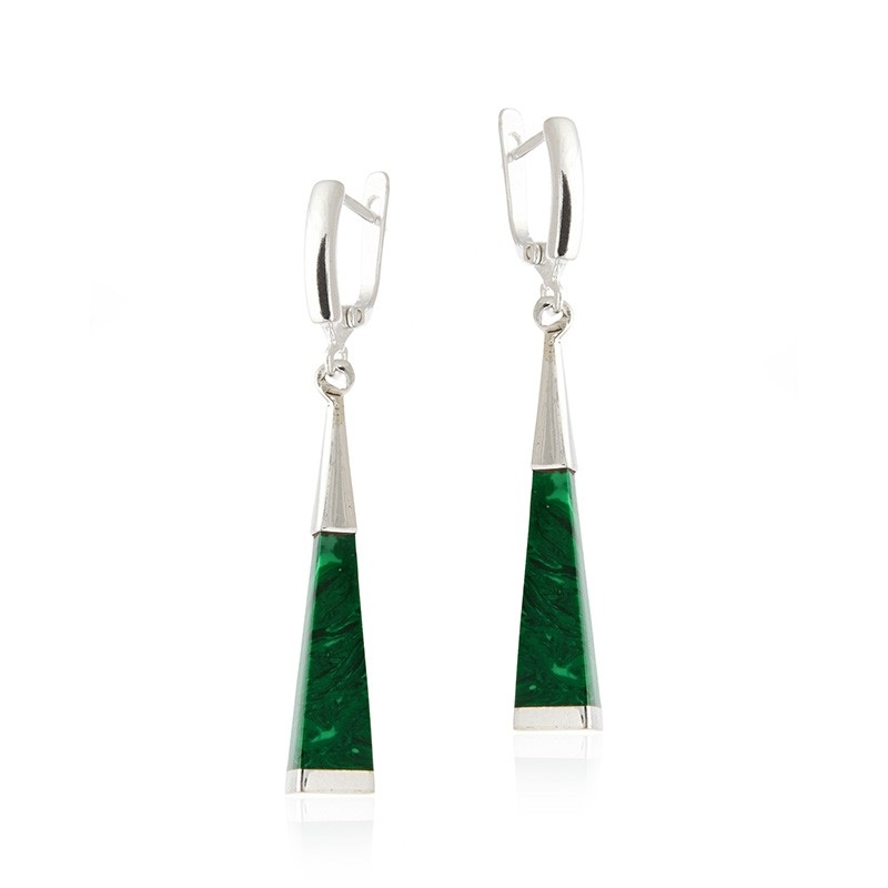 Kamienie: malachitWymiary kolczyków – dł. 4,5 cm (razem z biglem)/szerokość 0,5 cmTyp zapięcia kolczyków – bigiel angielski (istnieje możliwość zamówienia bigla zwykłego – otwartego)Opakowanie do kolczyków gratis – na załączonym zdjęciu.
