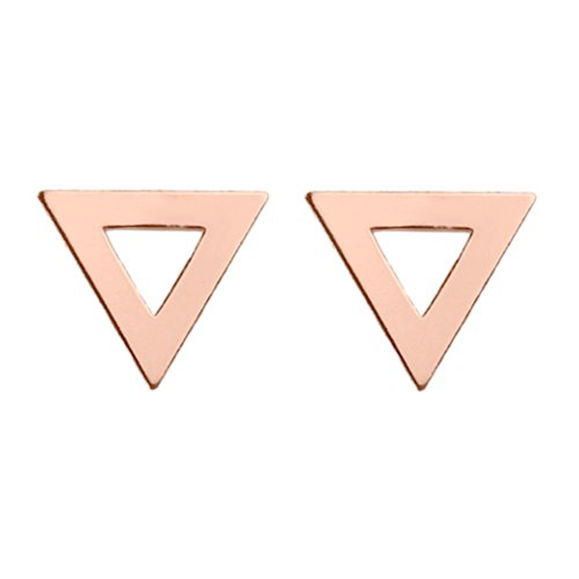 Złote kolczyki w kształcie trójkącików. Zapinane na sztyft. Kolczyki posiadają zapięcia (baranki). Kolczyki w całości wykonane są ze srebra 925 powlekanego 24 karatowym różowym złotem.