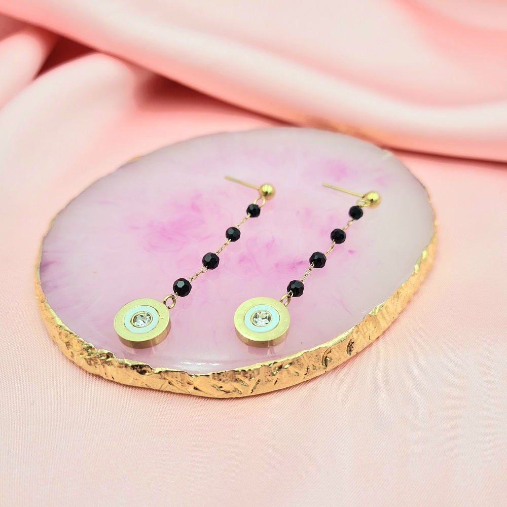 Kolczyki wiszące ze stali chirurgicznej 316l, czarne spinele zdobione złotym kółeczkiem ze znakami rzymskimi i cyrkonią. Śliczne kolczyki będą pasować do wielu stylizacji.