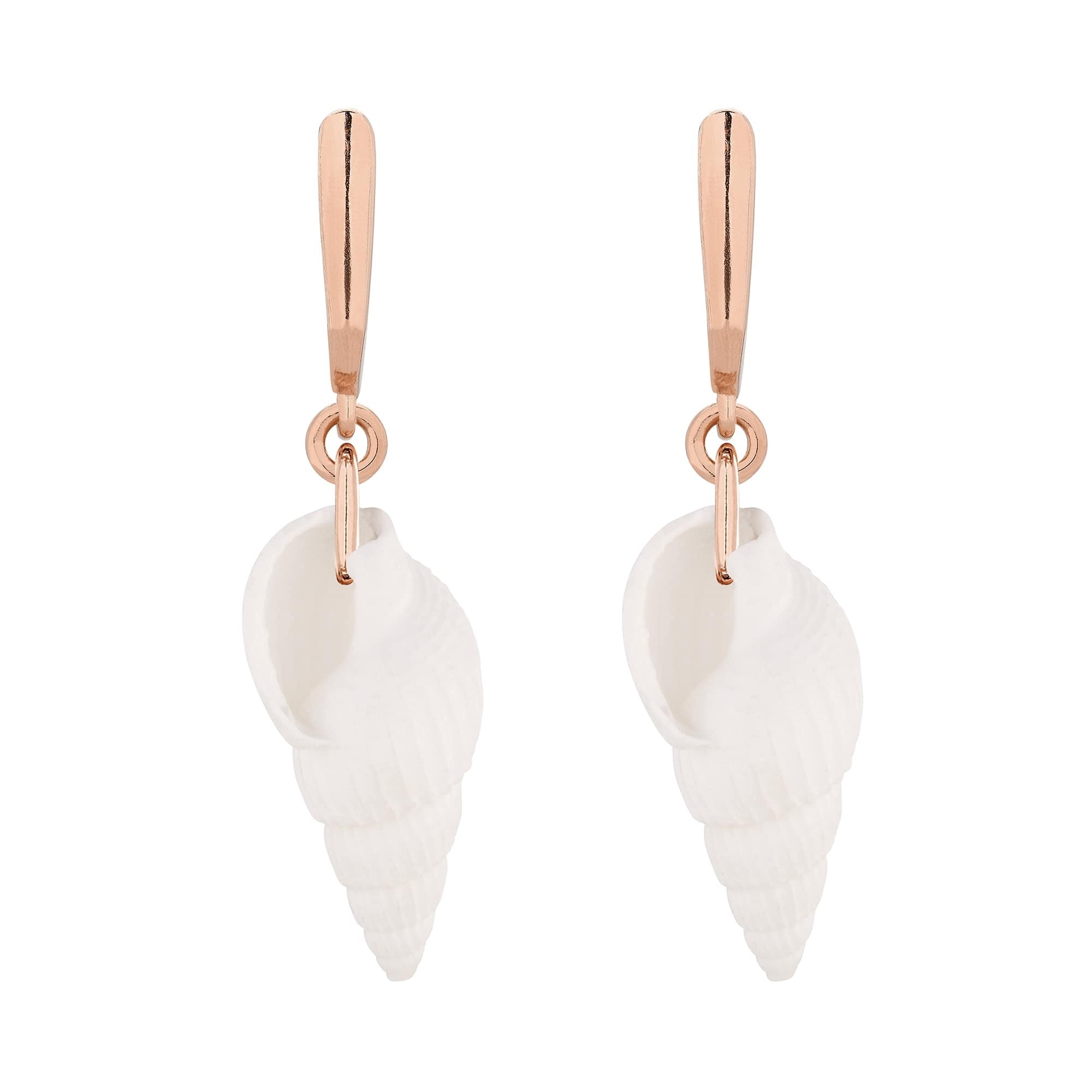 Złote kolczyki z białymi muszelkami. Zapinane na bigle angielskie. Całość wykonana ze srebra 925 powlekanego 24 karatowym żółtym złotem.