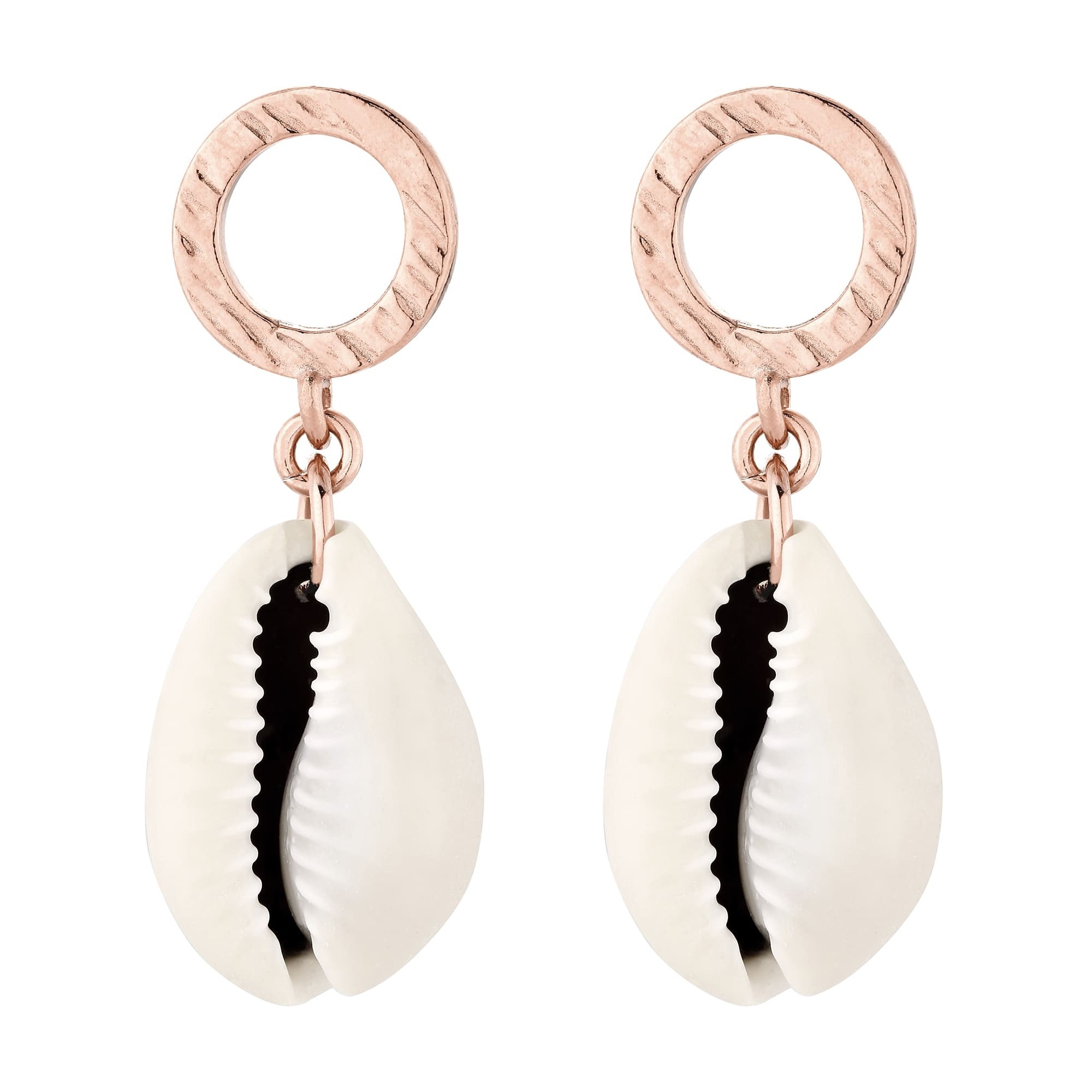 Złote kolczyki z chropowatym kółeczkiem i dużą muszelką. Zapinane na sztyft. Kolczyki posiadają zapięcia (baranki). Całość wykonana ze srebra 925 powlekanego 24 karatowym różowym złotem.