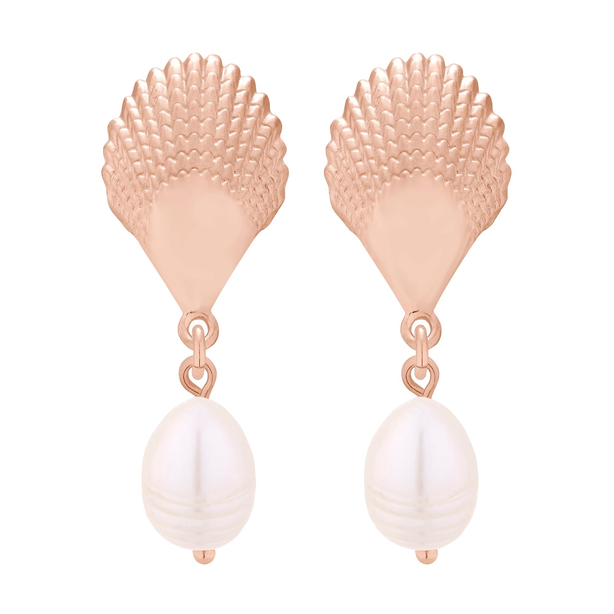 Złote kolczyki wykonane z muszelek i naturalnych pereł słodkowodnych.