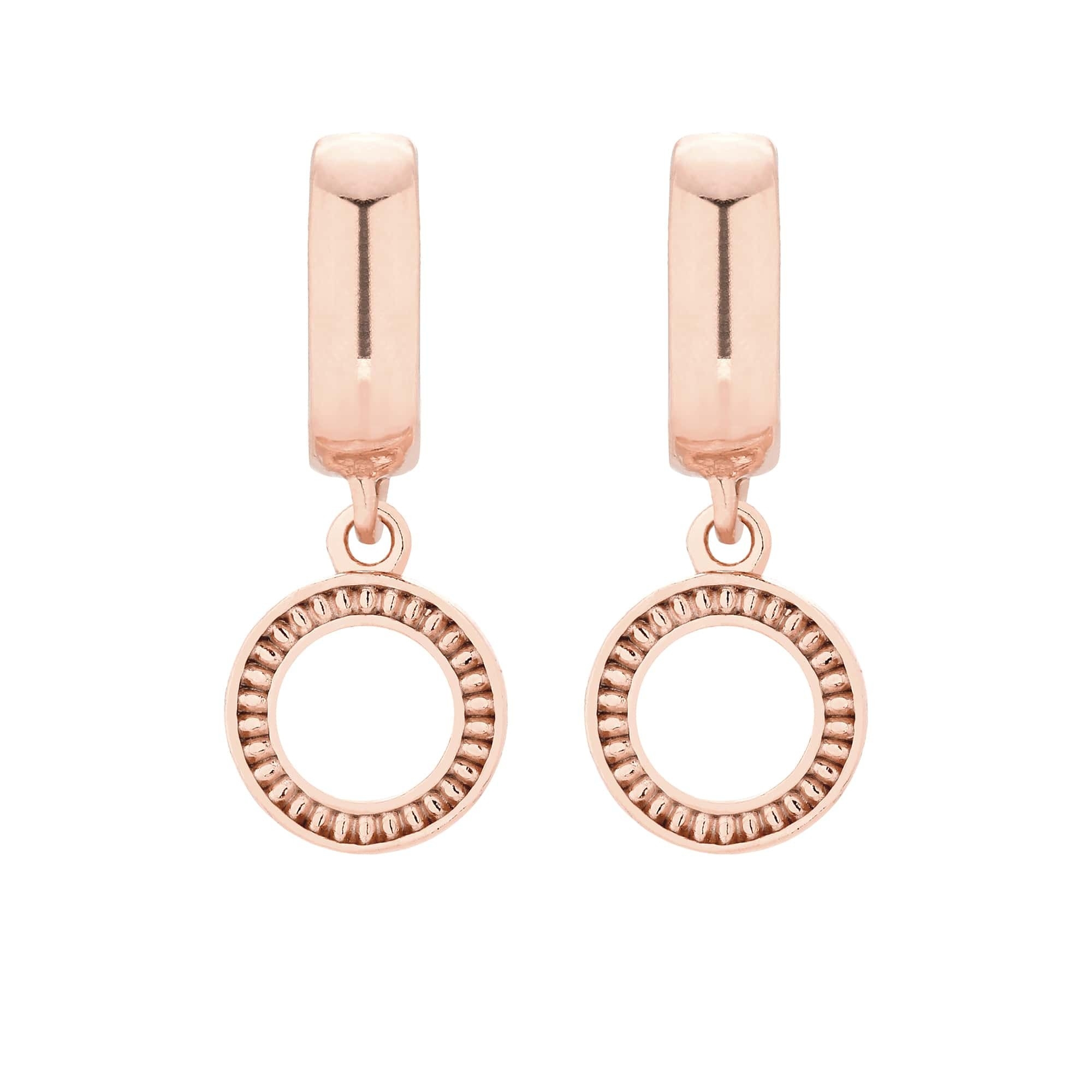 Złote długie kolczyki z ozdobnymi kółeczkami zapinane na bigle. Całość wykonana ze srebra 925 powlekanego 24 karatowym różowym złotem.