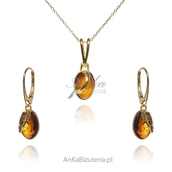 Komplet biżuteria srebrna pozłacana z koniakowym bursztynem