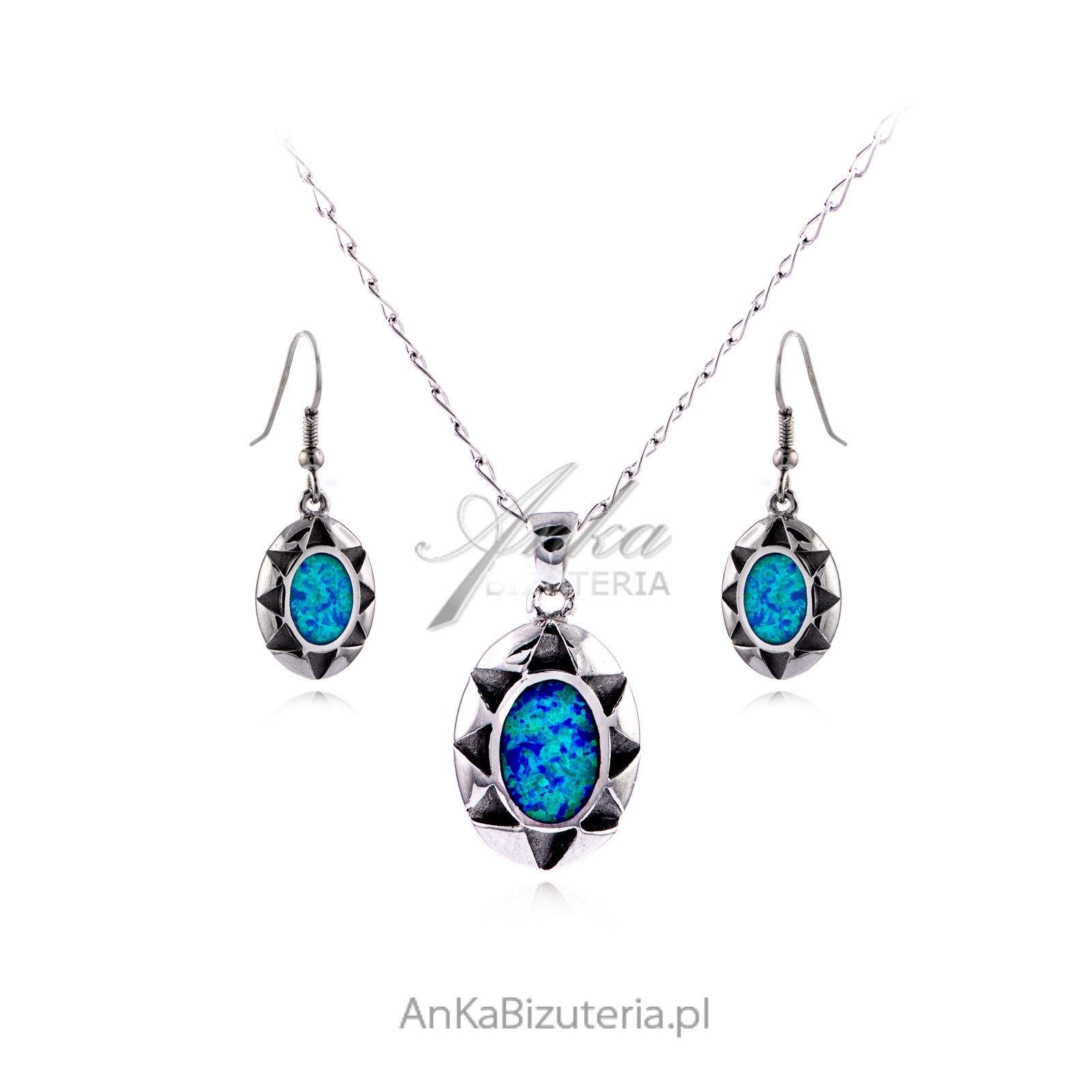 Srebrny komplet pr. 925 rodowany z niebieskim opalemWaga kolczyków ~ 6,6 gWaga wisiorka ~ 3,1 gWymiary kolczyków – 3,2 cm razem z biglem /szerokość do 1,2 cmWymiary zawieszki – długość całkowita 2 cm  x  szerokość do 1,2 cmTyp zapięcia kolczyków  -bigiel otwartyOpakowanie do kompletu gratis – na załączonym zdjęciu.