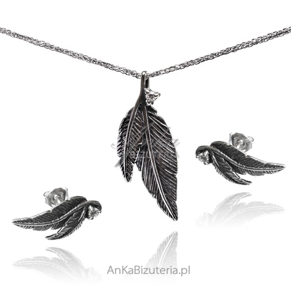 Komplet biżuterii srebrnej oksydowany listki z cyrkoniami