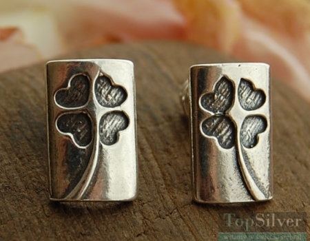 Srebrne urocze kolczyki, na których wypolerowanej powierzchni znajduje się emblemat czterolistnej koniczynki.