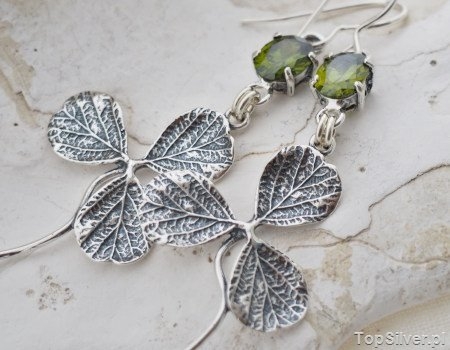 Srebrne kolczyki koniczynki – symbol szczęścia a także hit popularności. Trzylistna koniczynka połączona została z pięknym oliwinem zakutym w srebrną oprawę.