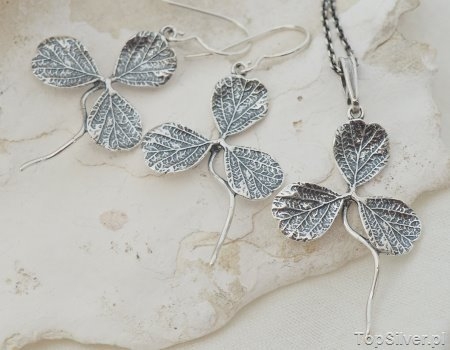 Srebrny komplet – kolczyki i wisiorek, przedstawiający listeki trzylistnej koniczynki. To wspaniały pomysł na prezent.