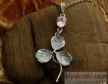 Srebrny wisiorek koniczynki – symbol szczęścia a także hit popularności. Trzylistna koniczynka połączona została z pięknym różowym kryształem Swarovskiego, zakutym w srebrną oprawę.