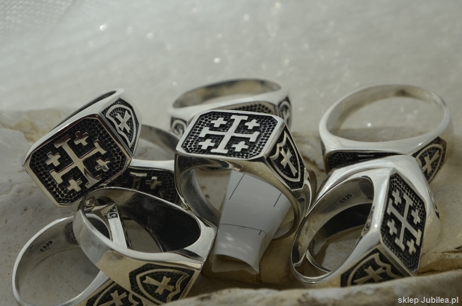 Przedstawiamy srebrny sygnet w którego centralnym miejscu widnieje krzyż jerozolimski, symbolizujący pięć ran Chrystusa ukrzyżowanego. Po obu stronach sygnetu widnieją dwa krzyże templariuszy powszechnie uznawane za symbole męstwa. Ten piękny srebrny sygnet dostępny jest w pełnej rozmiarówce jubilerskiej. A precyzyjne wykonanie sprawi że będzie przukuwać uwagę.