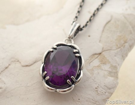 Bardzo elegancki, srebrny wisiorek, w którego delikatną srebrną oprawę zakuto okazały fasetkowany ametyst z pracowni Swarovskiego.