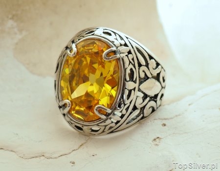 Piękny ciepły, żółty kolor kamienia, który zjawiskowo połyskuje w promieniach słońca plus metal szlachetny jakim jest srebro – to początek czegoś pięknego. Przedstawiamy Państwu, srebrny sygnet, którego kształt i wygląd z całą pewnością sprawiają wrażenie, że mogą go nosić zarówno Panie jak i Panowie. Mimo ażurowej konstrukcji sygnetu, jest on stosunkowo masywny, zakuty w nim cytryn (synt) przyciągać będzie uwagę. Wielkość kamienia (owal) to aż 12x16mm.