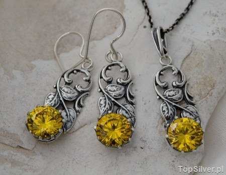 Srebrny zestaw w składzie kolczyki i wisiorek, symboliką nawiązujący do okresu secesji, w którego srebrne motywy roślinne zakuty został okrągły cytryn. Cała kompozycja sprawi że poczujesz się piękniejsza.