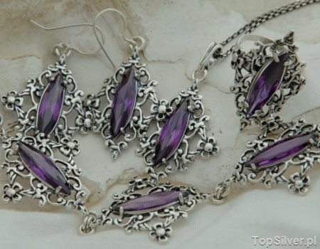 Stylowy, srebrny zestaw biżuterii (bransoleta, kolczyki, wisior oraz pierścień), którego wzronictwo inspiracji szukało w jubilerstwie carskiej Rosji. W misterny motyw zdobniczy zakuto pięknie wybarwiony ametyst (synt).