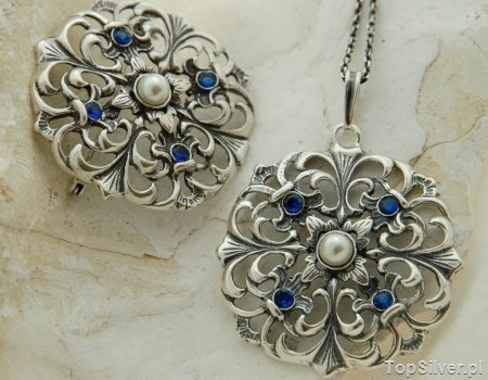 Efektowny srebrny komplet(wisior i broszka), w kształcie secesyjnej rozety, w centralnym miejscu którego wkomponowano naturalną perłę a po jej czterech stronach umieszczono maleńkie szafiry.