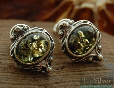 Wytworne, srebrne, oksydowane kolczyki, w których niezwykle delikatny wzór wkomponowano piękny bałtycki bursztyn, o zielonym zabarwieniu.