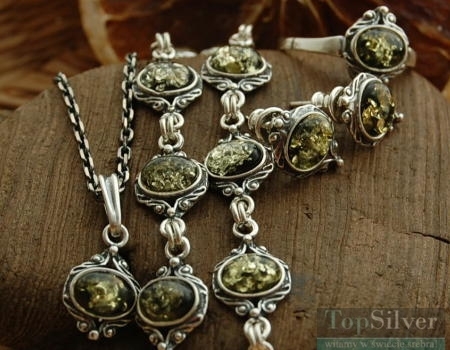 Wytworny zestaw srebrnej biżuterii, oksydowane elementy, w których niezwykle delikatny ażurowy wzór wkomponowano piękny bałtycki bursztyn o zielonym zabarwieniu.