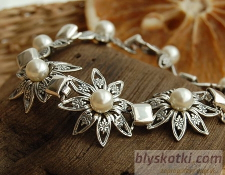 Okazała srebrna bransoleta, o pięknym ażurowym wzornictwie. W każdym z ośmiu mistrzowsko wykonanych ogniw znajduje się syntetyczna perła.