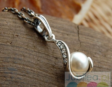 Elegancki i nowoczesny w stylistyce srebrny wisiorek, którym element stanowi perła opleciona srebrną gałązką w której umieszczono po 5 kryształków Swarovskiego.