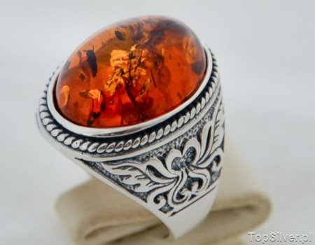 Przedstawiamy Państwu największy w naszej kolekcji srebrny sygnet. Największy bo sam bursztyn (naturalny) ma wymiary 15 x 20mm i ok 1cm wysokości. Takie insygnia na palcu nie będą niezauważone. Zarówno Panie lubiące duże okazałe pierścienie jaki i Panowie ceniący sobie biżuterie w postaci sygnetów, ten model jest dla Was. Zaprojektowany przez naszego złotnika miał nawiązywać do biżuterii magnackiej z XVII i XVIII wieku. Czy się udało? Sami Państwo oceńcie. Srebrne ornamenty po obu stronach sygnetu nieodwzorowującą symboli żadnego rodu więc nie jest to sygnet rodowy ale przy odrobinie wyobraźni można zbudować wokół niego legendę 🙂