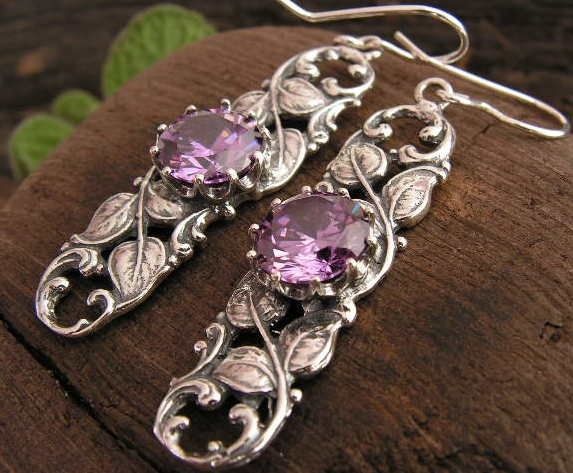 Stylowe, secesyjne kolczyki, które swój piękny wzór zawdzięczają przywiązaniu naszego rodzimego jubilerstwa do okresu secesji i uwielbieniu piękna. Całą kompozycję uzupełnia pięknie wybarwiony ametystem.