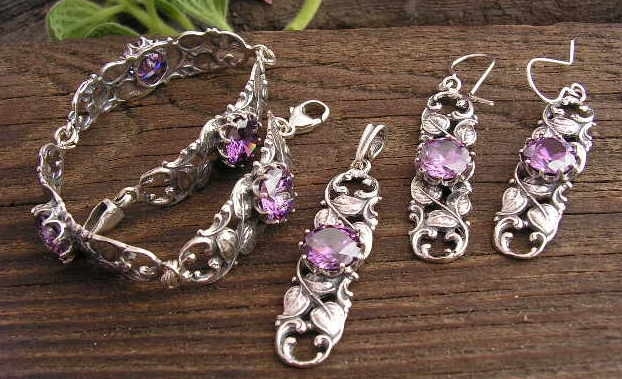 Stylowy, secesyjny zestaw bizuterii, który swój piękny wzór, zawdzięcza przywiązaniu naszego rodzimego jubilerstwa do okresu secesji i uwielbieniu piękna. Całą kompozycje uzupełnia pięknie wybarwiony ametyst.
