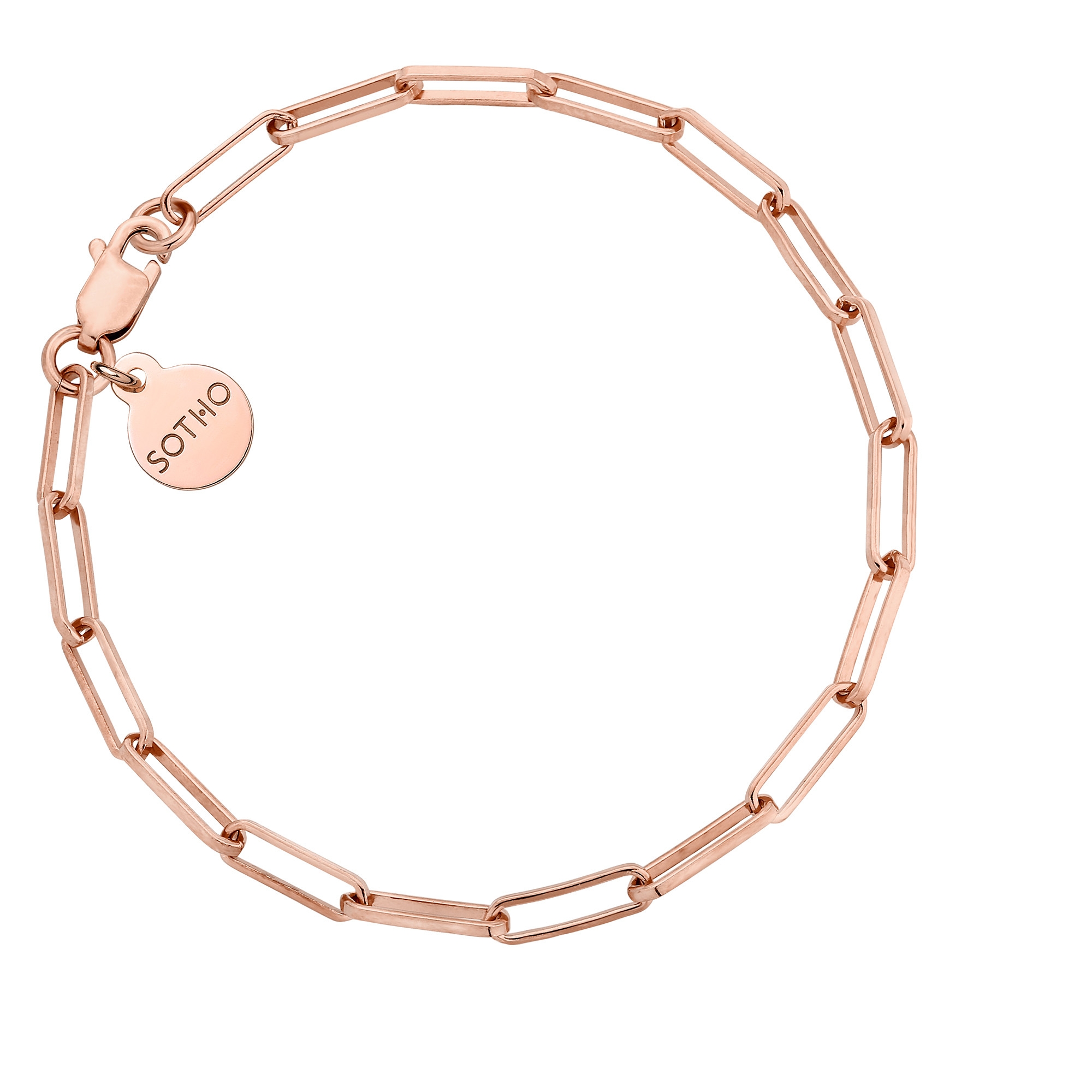 Złota masywna bransoletka z zawieszką z logo marki. Całość wykonana ze srebra 925 powlekanego 24 karatowym różowym złotem.