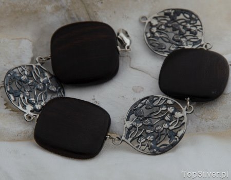 Wspaniała srebrna bransoleta, której secesyjne roślinne wzory wykończono starą techniką włókninowania – nadającą srebrze satynowego powabu, całość uzupełniają naturalne kawałki drewna hebanu – najmodniejszego wśród celebrytów.