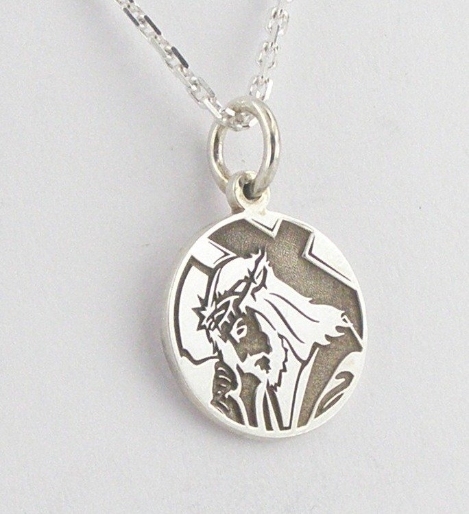 Medalik okrągły z wizerunkiem Chrystusa w koronie cierniowej niosącego krzyż.