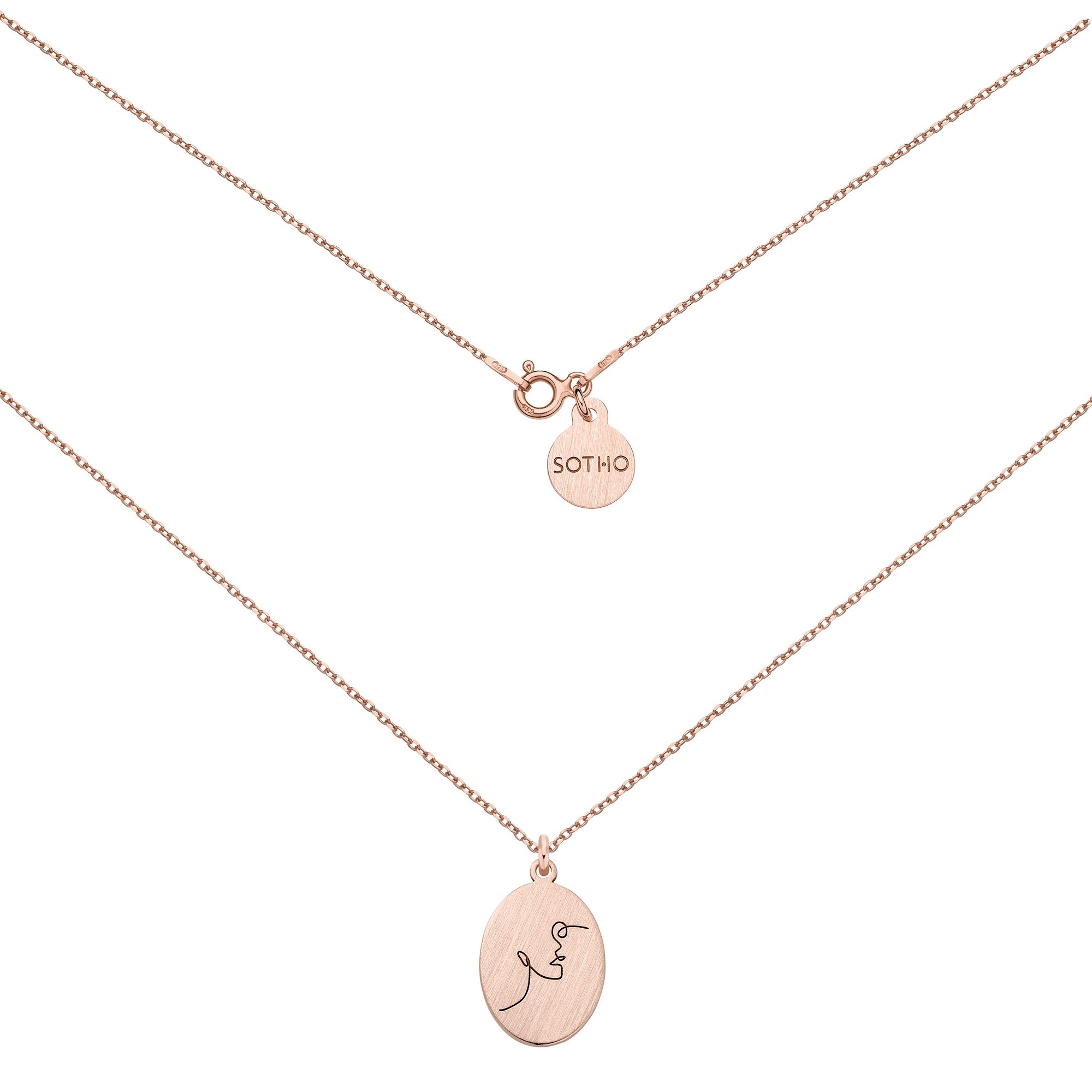 Złoty naszyjnik z matowym medalionem Face N°11 i zawieszką z logo marki. Całość wykonana ze srebra 925 powlekanego 24 karatowym różowym złotem.
