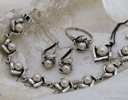 Mistrzowsko wykonany komplet biżuterii w składzie: bransoletka, kolczyki, wisiorek oraz pierścionek. W piękne symetryczne elementy wkomponowane zostały perły.