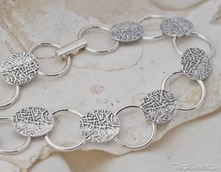 Przedstawiamy Państwu srebrną, oksydowaną bransoletkę. Bransoletka składa się z dziewięciu owali których powierzchnia inspirowana była motywem roślinnym – powierzchnią liścia. Owale połączone są srebrnymi kółeczkami, które są na luźno przymocowane od spodu owala. Taka konstrukcja sprawia, że bransoletka idealnie układa się na nadgarstku. Zapięcie bransoletki to tak zwana klamra zegarkowa – która dodatkowo nadaje eleganckiego wyglądu tej pięknej bransoletce.