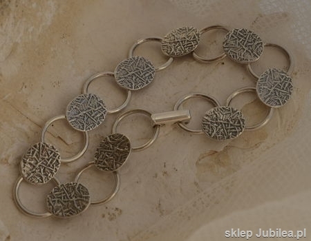 Przedstawiamy Państwu srebrną, oksydowaną bransoletkę. Bransoletka składa się z dziewięciu owali których powierzchnia inspirowana była motywem roślinnym – powierzchnią liścia. Owale połączone są srebrnymi kółeczkami, które są na luźno przymocowane od spodu owala. Taka konstrukcja sprawia, że bransoletka idealnie układa się na nadgarstku. Zapięcie bransoletki to tak zwana klamra zegarkowa – która dodatkowo nadaje eleganckiego wyglądu tej pięknej bransoletce.