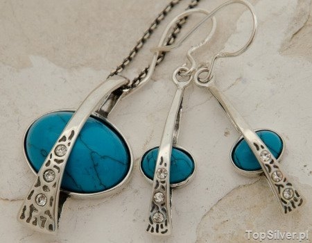 W motyw zdobniczy biżuterii wkomponowany został turkus (synt) oraz białe, połyskujace cyrkonie.