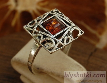 Piękny srebrny pierścień, inspirowany osiągnięciami imperium biznatyjskiego. W misterne filigranowe zdobienia wkomponowano bałtycki bursztyn.