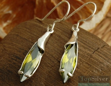 Niezwykle eleganckie aczkolwiek bardzo proste kolczyki, w których srebrną smukłą oprawkę zakute zostały podłużne, fasetowane oliwiny (syntetyczne).