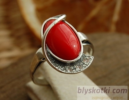 Wytworny, srebrny, oksydowany pierścień, w którego niezwykle delikatny ażurowy wzór wkomponowano koral o wymiarach (9x13mm) oraz 3 kryształki Swarovskiego.