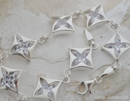 Wykonana w całości ze srebra bransoletka z dość specyficznym zakuwaniem kamieni Obsadzenie cyrkonii następuje od spodu dekoracji każdego ogniwa. Dzięki temu kamień nie wypadnie a sama budowa bransletki będzie wzbudzać zainteresowanie i przyciągać spojrzenia. Wykończenie bransoletki to wysoki połysk.