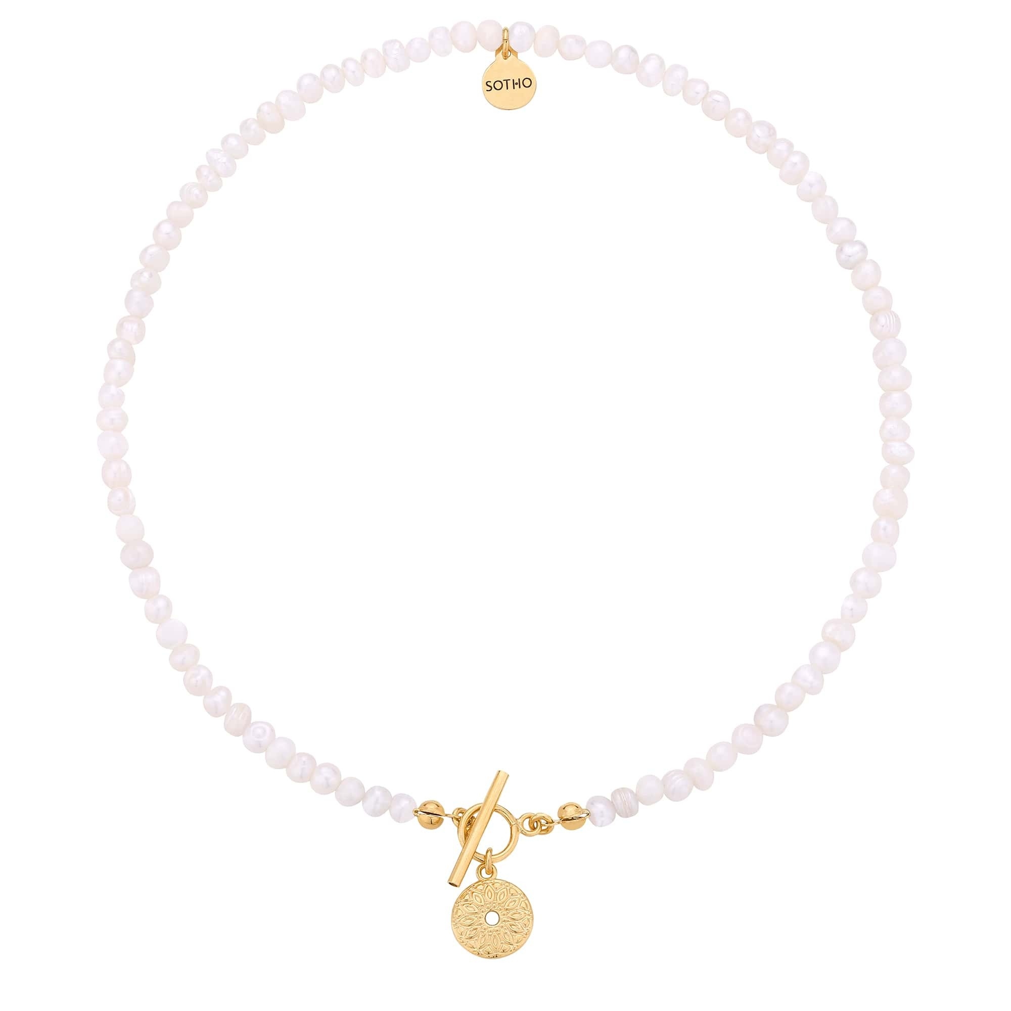 Złoty naszyjnik wykonany z naturalnych pereł słodkowodnych, zdobiony zapięciem i medalionem oraz logo marki. Wszystkie elementy wykonane ze srebra 925 powlekanego 24 karatowym żółtym złotem. Perły są nieregularne, unikatowe, delikatnie różnią się od siebie i mogą różnić się od tych na zdjęciu.