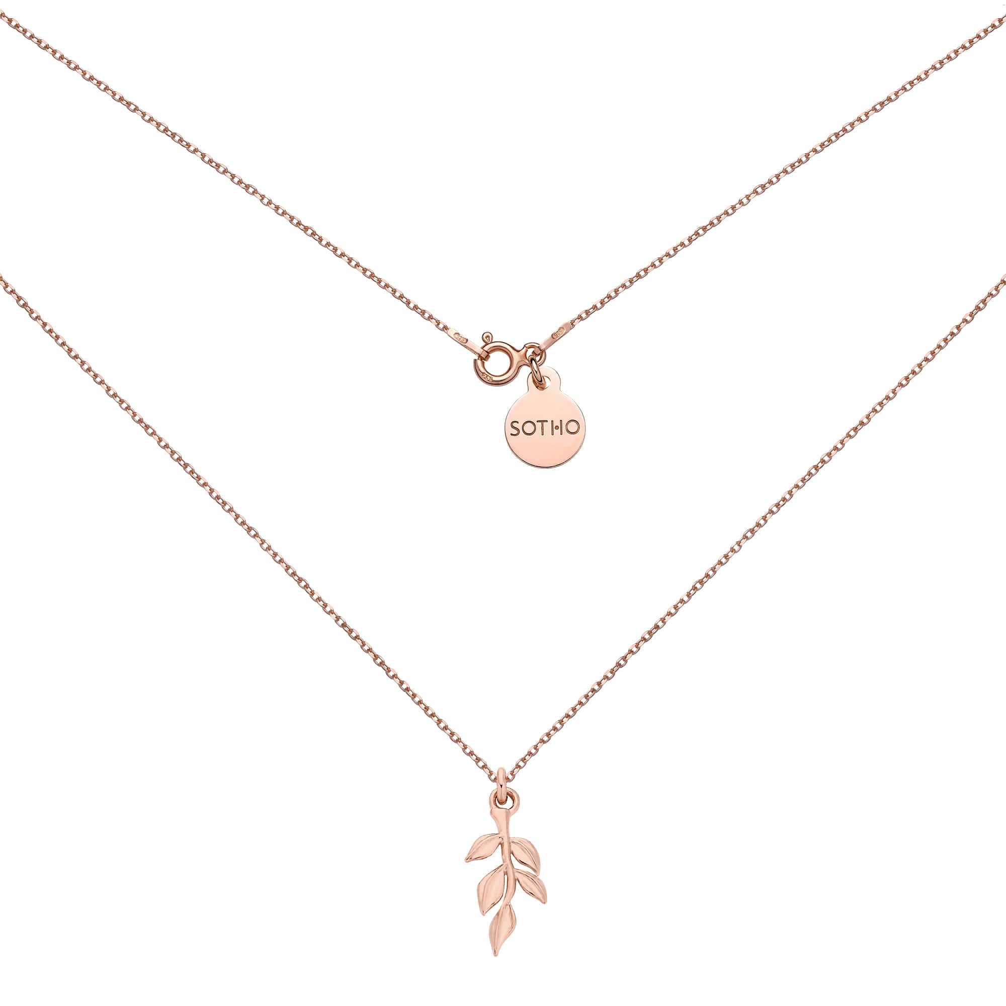 Złoty naszyjnik z gałązką oraz z logo marki. Całość wykonana ze srebra 925 powlekanego 24 karatowym różowym złotem.