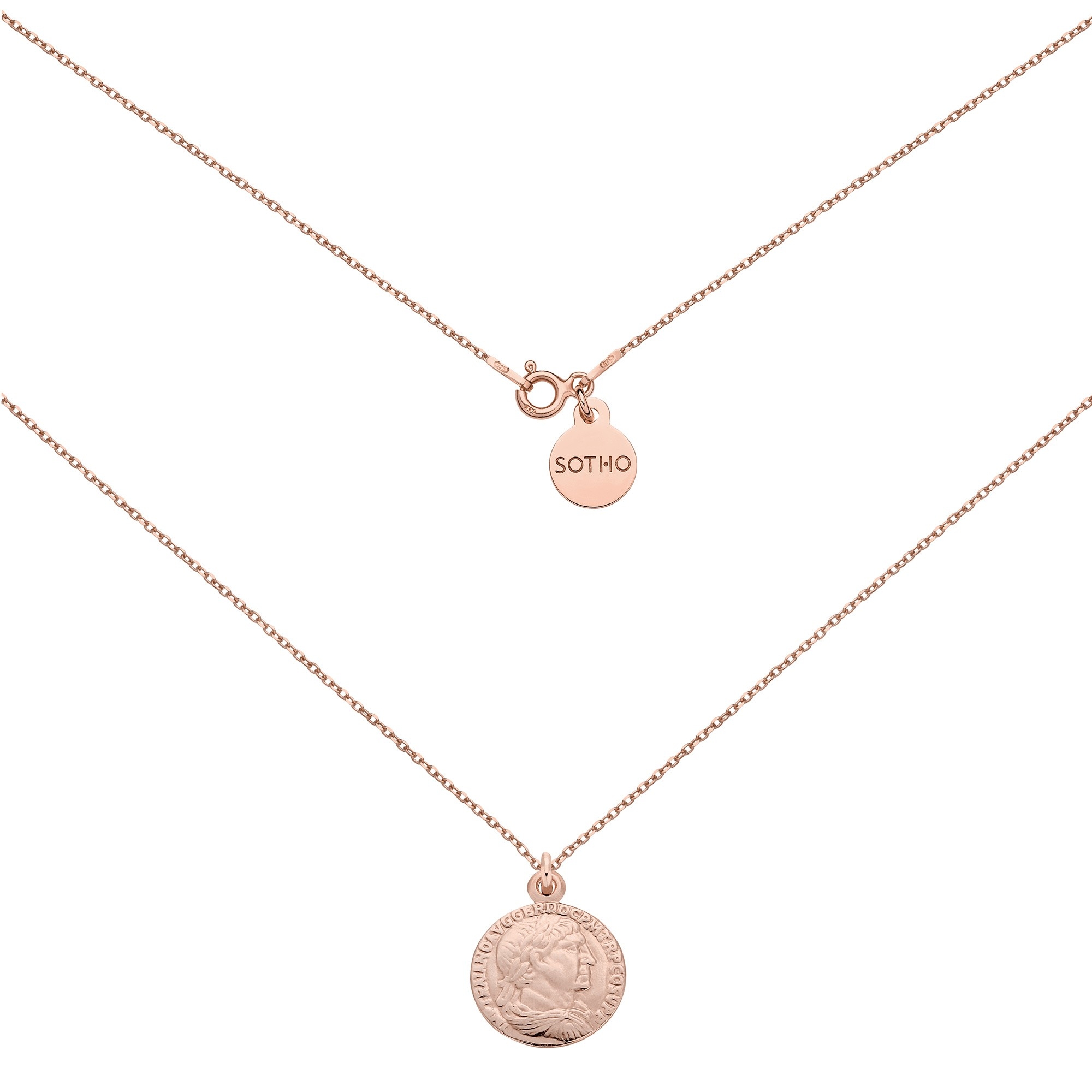 Złoty naszyjnik łańcuszkowy zdobiony monetą i zawieszką z logo marki. Całość wykonana ze srebra 925 powlekanego 24 karatowym różowym złotem.